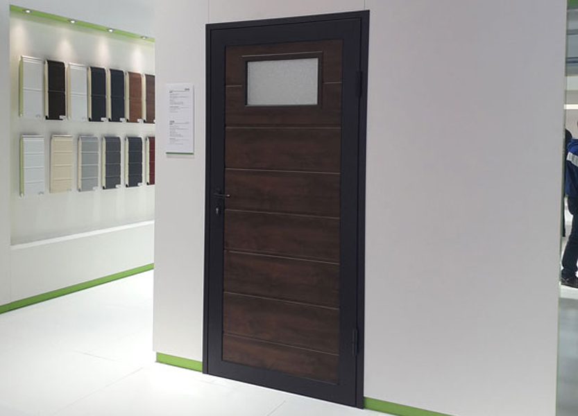 Дверь изготавливается из тех же панелей, что и ворота. Благодаря этому обеспечивается их гармоничное сочетание, а фасад здания приобретает завершенный вид.